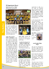 PE Department (Boys) Seniors get off to a ‘flyer’ opportunity to play on a with new kit from the RAF full sized 4G synthetic pitch. Dunclug took the ini- tiative early on and scored through Andrew Smyth, with further goals scored by Lee O’Brien before half- time to give the school a commanding 3-1 lead going into the interval. In the second half, when more space began to develop the longer the The Bellfort The senior football team and attacked at will, with match went on, Dunclug really turned on the style got off to a ‘flying start’ in further goals scored by Ben Wylie (2) and Lee O’Brien their newly acquired kit bringing his personal tally sponsored by the RAF. to five for the game! They beat Cullybackey Col- lege 2-1 in a very closely Under 13 lymena Showgrounds. contested match at the Bal- Jack Millar, captain of the team with Goals were scored by Aaron Weir receives the the William Monaghan to pro- new kit from RAF. Flt Lt. ‘Guardian vide a one-nil lead at half- Dougal Gow and Sergeant Cup’ time, only for Cullybackey Dave Lisley to equalise with less than ten minutes of the match Guardian Cup Success for left. However, Kyle Mark Under 13 Football Team 2014 Dunclug College became the hero of the day The Under 13 football team Rugby when, just after coming on had the perfect finish to as a substitute, he scored their season with a very This year we managed to with a volley directly from a convincing 8-1 victory over field four rugby teams to corner kick with his first take part in the East Antrim kick of the ball! The boys Secondary Schools rugby were, obviously, delighted leagues and tournaments. with the result and all en- joyed the experience of Every team from Year 8 to playing in the new kit. They Year 11 also competed in all looked very professional the Ulster Schools Qualifier and were a credit to the competitions and were school in terms of behav- very competitive in all year iour and levels of sports- St. Killien’s in the final of groups. manship shown through- the Mid Antrim Schools’ out the match. Guardian Cup. This game The new crop of Year 8 was played at ‘The Cliff’ rugby players have shown venue in Larne, giving good commitment to train- many of the players in- ing both on a Friday and 64 volved their first Tuesday afternoons.