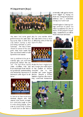 PE Department (Boys) extremely well against teams much bigger by relying on their very strong and physical defence and a technically strong scrum and maul. Overall rugby in Dunclug Col- lege continues to grow not only in popularity but also in terms of the player’s knowl- edge, commitment as well as their individual skill levels. The team had some good play for one another which performances this year beat- has seen them come to close ing Larne High in their first to defeating some of the top ever match scoring 9 tries teams in Ulster. and losing narrowly to Larne Grammar. The Year 8 team should be proud of the pro- SUMMER 2014 gress they have made this year and should seek to build upon this next season. Year 9 continue to be an ex- tremely tight unit and have progressed further this sea- son. The team have scored Finally the Year 11 rugby team some excellent tries and had a tough year with regard have developed their individ- to the number of fixtures ual positional understanding cancelled due to wet and realise the importance of weather and water logged teamwork with regard to de- pitches. Despite a limited fence. number of games this season they conducted themselves In Year 10 we have some very talented players who this season have found competi- tion extremely tough as this is a very strong league. How- ever as a team they continue to work hard on the field of 65