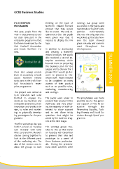 GCSE Business Studies IFA ENTERPRISE thinking of the type of running; our group were PROGRAMME Northern Ireland themed successful in the pasta and product that they would marshmallow ‘build it’ com- This year, pupils from the like to create. The only re- petition. Unfortunately Year 11 GCSE Business Stud- quirements that the pupils that was the only prize that ies class take part in the were given was that it we picked up that day how- enterprise programme that needed to display the IFA ever the team showed had been developed by the logo. great maturity and commit- Irish Football Association ment throughout the and Invest Northern Ire- In addition to developing whole process. land. and creating a Northern Ireland product; the pupils also received a second en- terprise workshop which focused more on preparing the business plan for the judges and to choose the 2 SUMMER 2014 Over 300 young people groups that would go for- from 23 secondary schools ward to present to the- across Northern Ireland whole staff. Pupils needed took part in the Irish Foot- to be confident on many ball Association’s enter- aspects of their product prise programme. such as on possible sales, marketing, manufacturing The project was aimed at and costings. 15-16 year-olds and used football to engage stu- The pupils were asked to The programme was made dents on key business and present their product in the possible due to the gener- enterprise awareness, from staffroom and very pleas- ous support of the NI Ex- innovation and product de- ing the majority of staff at- ecutive through the sign, to sales and market- tended to show support ‘Promoting Equality, Tack- ing, to physically develop- and to ask those tricky ling Poverty and Social Ex- ing prototypes for the pro- questions that might be clusion through Sport’ pro- gramme. asked by the business drag- gramme. ons at the next stage. The first workshop day was held in school on Tuesday The winning group trav- 15th October with both elled to the La Mon Hotel Miss Laird and Mr. Moore’s on Tuesday 10th December classes coming together to to present their idea and look at the different parts prototype to a panel of of the marketing mix. The three business profession- aim of this session was to als. During the presenta- allow the groups to start tions other activities were 77