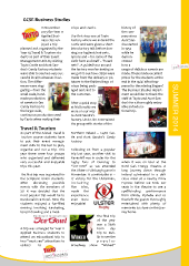 GCSE Business Studies In November crisps and snacks. history of 2013 the Year 11 the com- Applied Busi- Our first stop was at Tayto pany since ness class en- Factory where we entered the Aunt San- joyed a trip castle and were given a short dra started planned and organised by the introductory talk before don- in 1953 Year 14 Travel & Tourism stu- ning our hygienic hair nets, while he dents as part of their Event aprons and – for some of the demon- Management Unit. By visiting sixth form and staff – “beard strated Tayto Castle and Aunt San- nets”. A guided tour around how a dra’s Candy Factory students the factory was fascinating as range of delicious sweets are were able to see two very suc- we got to see how crisps were made. These made excellent cessful local businesses in ac- made from the delivery or po- prizes for the students at the tion. The differ- tatoes to the finished bags of end in the quiz! What hap- ences were stag- crisps being pack- pened to the missing fingers? gering—from the aged and sent to The Business Studies depart- small scale, hand- the customer. ment would like to thank the made production staff at Tayto and Aunt San- of sweets in the After a quick stop dra’s for a thoroughly enjoy- Candy Factory to at McDonalds we able and educa- SUMMER 2014 the large scale, were on our way tional trip. continuous production used to Aunt Sandra’s by Tayto when making their factory. Uncle Jim entertained the group with stories of the Travel & Tourism As part of the A-level Travel & Northern Ireland – Tayto Cas- Tourism course students have tle and Aunt Sandra’s Candy to put their event manage- Factory. ment skills to the test to plan, organise and run a trip. This Following on from a popular year there were four groups trip last year, another visit to who organised and delivered Ravenhill was in order for the very successful and enjoyable rugby fans of Dunclug to when it was on tour at the trips this year. “SUFTUM” as we attended Bord Gais Energy Theatre. A the Ulster v Edinburgh game in long journey down through The first trip was organised for November. A comfortable 41 – Ireland culminated in a deli- the Scripture Union students. 17 victory for the Ulstermen, cious meal at a nearby Pizza After discussing possible including Express before we took our events with the members of five tries, seats in the theatre to see a SU it was decided that the made the spell-binding performance most popular trip would be to experience from Glinda, Elphaba and co Dundonald Ice Bowl. Here the even more that left the guests thoroughly students enjoyed a fun-filled enjoyable! entertained with plenty of evening involving ice-skating, memories to share on the jour- ten-pin bowling and a meal. ney home. The final trip of the year was a Sixth A trip was arranged for Year 11 Form day Applied Business students to trip to Dub- attend an educational trip to lin to see the two “must see” attractions to popular visitors to Broadway show “Wicked” 79