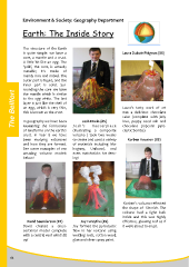 Environment & Society: Geography Department Earth: The Inside Story The structure of the Earth is quite simple: we have a Laura Dubois-Pidgeon (8S) core, a mantle and a crust. A little bit like an egg. The ‘yolk’, the core, is actually metallic; it’s made of mainly iron and nickel. The outer part is liquid, and the inner part is solid. Sur- rounding the core we have The Bellfort layer is just like the shell of Josh’s masterpiece Laura’s tasty work of art the mantle which is similar to the egg white. The last an egg, which is very thin, was a delicious chocolate this is known as the crust. cake (complete with jelly lava, poppy seed ash and In geography we have been Josh Erwin (8S) chocolate popcorn pyro- examining the formations of landforms on the earth’s crust. In Year 8 we have volcano ) took two weeks to create and used a variety Korben Houston (8S) been studying volcanoes (illustrating a composite clastic bombs). and how they are formed. of materials including Ma- See some examples of our hogany, Unibond, and amazing volcano models even matchsticks for fenc- below! ing! Korben’s volcano reflected the shape of Slemish. The volcano had a light bulb inside and this was highly David Saunderson (8T) Joy Forsythe (8S) effective, glowing red as if David created a cross- Joy formed the pyroclastic it were about to erupt. sectional model complete flow in her volcano using with a central vent which lit welding rods, cotton wool, up! glue and silver spray paint. 84
