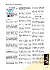 Performing Arts Department Our Days Out Ultimate Feel-Good Show’ entertainment you might This year and the performance did be inclined to ask, “What’s has seen not disappoint. next for the students of the the Per- Performing Arts depart- forming In March the PA students ment?” The answer is – Arts de- were given the opportunity partment “Lots!” Watch this space. to attend Northern Ire- yet again land’s most modern thea- Girls Like That attend a number of professional live tre, The Mac, Belfast. This ‘Girls Like That’ by Evan productions. was in order to watch the production ‘One Sandwich Placey begins in a history Firstly, the PA Department Short of a Genius’ by the Big class. The learning of the attended Willy Russell’s in- Telly Theatre Company importance of the Sufra- famous musical ‘Blood gette Movement is disrupt- who are a local theatre Brothers’ at the Grand ed when a photo of Scar- company known for creat- Opera House. ‘Blood Broth- ing new and devised work. lett, completely naked, is ers’ is a popular and inter- sent around the class. Will nationally renowned musi- The comedy was thorough- cal, holding the award for ly enjoyed by all and made the other girls who have the third longest running for a fun analysis back in known her from primary musical in the West End of the classroom with AS pu- school ofer her help? No. London. Pupils loved They are too busy forward- pils choosing it for their watching the Drama be- ing the message and talk- theatre exploration pro- tween twins Mickey and ject. ing about it behind her Edward unfold and listen- back. With monologues ing intently to the musical’s In April of this year a cross- sending the play back in classic score including fa- section of pupils were time to when women mous songs such as ‘Tell Me It’s Not True’. Having treated to AlterEgo Theatre fought so hard for equal an opportunity to visit Bel- Company’s performance of rights, this is a thought- fast’s premier theatre is ‘Chelsea’s Choice’ in our provoking Drama that always an enjoyable experi- very own school hall. The meets the stimulus ‘The ence for everyone, and this production looked at issues Concept of Time’ that the was clear by the positive surrounding child exploita- AS Performing Arts Class feedback . tion and has been viewed were congratulated for The Riverside Theatre, Col- by over 200,000 young their end of year perfor- eraine, was the venue for people throughout the UK. mance theme. Collaborat- our second theatrical out- In a fast paced and engag- ing as an ensemble to cre- ing of this academic year. ing performance, the piece ate a fast moving perfor- Our group of theatre en- was innovative in raising mance, the piece jumps be- thusiasts attended the the- awareness of a social issue tween comical and heart atre in January and enjoyed the Ballywillan Drama as well as showing PA pu- wrenching moments and Group’s interpretation of pils the power of Theatre in capture the attention from iconic musical ‘Hairspray’. Education (TIE). After an the audience, enthralling The show was billed as ‘The exciting year of theatrical them from start to fnish. THE BELLFORT SUMMER 2015 105
