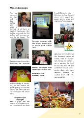 Modern Languages The de- French Club began after partment Christmas for Year 8 pupils bid fare- where they played lan- well to guage games, songs and Mrs tried some French cuisine. Laftte after 23 years at Dunclug, 15 of those as Head of Department. Mrs Laftte now works for CEA and we wish her every suc- cess for the future. The European countries while Year 12 had the opportunity to sample some Spanish tapas. 10L5 have been looking at the Normandy region of France, with its architec- Department welcomed Mrs ture, history and scenery – McAllister, her expertise not to mention the food! In class they tried brie and Modern Languages Prize camembert cheese on ba- Day Winners October 2014 guette, along with some delicious pancakes, all KS3 Kristyn Chan washed down with very KS4 Kirsty Fraser tasty apple fzz. and knowledge is invalua- ble, she has worked dili- gently getting to know her classes, the wider staf and has embraced the school ethos. European Day of Languages Year 8 pupils had the chance to take part in quiz- zes about France and other THE BELLFORT SUMMER 2015 79