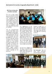 Environment & Society: Geography Department – GCSE GIS Trip to University of Ulster Coleraine The Year 12 GCSE Geogra- phy class took part in a new STEM initiative promoting GIS (Geographical Infor- mation Systems). The class were invited to the Univer- sity of Ulster Coleraine to work alongside PGCE stu- dents to complete a GIS task using their state of the The applications of GIS Students quickly got to art software. were also addressed in this grips with the equipment day -long event. Pupils took and were able to navigate GIS are computer-based part in a task where special- their way around the Dia- systems that enable users ist tracking devices were mond Hall with surprising to integrate a range of geo- used to monitor their loca- accuracy! graphic data to understand tion as they walked around their environment. GIS are campus. The data was col- a fundamental and fast- lated and recorded via sat- growing part of the econo- ellite allowing us to moni- my on a regional, national tor in a real time the loca- and global scale. This taster tion of each pupil. The ac- session not only aforded curacy of such devices the GCSE students the op- were impressive, being pre- portunity to develop new cise to within a 30 cm area. skills but also proved in- formative from a careers aspect where students We also had a glimpse of were told of the numerous the future using GIS with careers available to GIS Paul Alexander fies the pupils being able to fy an graduates. £800 drone helicopter us- drone under instruction from Dr P Mackenzie (UUC) ing GIS software. THE BELLFORT SUMMER 2015 81