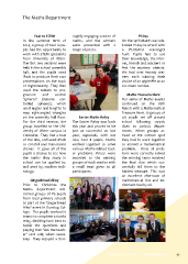 The Maths Department Year 10 STEM oughly engaging session of Pi Day In the summer term of maths, and the winners On the 14th March we cele- 2014, a group of Year 10 pu- were presented with a brated Pi day in school with pils had the opportunity to range of prizes. a Pi-related scavenger work with STEM specialists hunt. Pupils had to use from University of Ulster. their knowledge, the inter- The frst two sessions were net, friends and teachers to held in the school assembly fnd the mystery objects. hall, and the pupils used We had over twenty win- iPads to produce their own ners each winning their presentations on the topic choice of an apple Pie or an of trigonometry. They then ice cream sundae. used the tablets to pro- gramme and control Maths Treasure Hunt ‘spheros’ (remote con- Our series of Maths events trolled spheres), which continued on the 18th used angles and lengths to March with a Mathematical map right-angled triangles Treasure Hunt. 10 groups of on the assembly hall foor. Easter Maths Relay 4-5 pupils set of around For the third session, the The Easter Relay was back school following cryptic group travelled to the Uni- this year and proved to be clues to various depart- versity of Ulster campus in just as successful as last ments. When groups ar- Coleraine. They had a tour year, especially with our rived at the correct spot of the site, and used iPads new Year 8 pupils. Teams they had to work together to control and manoeuvre worked together to solve to answer a mathematical drones. It gave all of the various Maths-related East- problem. Once all prob- pupils a chance to see how er problems. Prizes were lems were correctly solved the maths they study in awarded to the winning the winning team received school can be applied to, groups of each session with the fnal clue which suc- and used by, modern tech- a small treat given to all cessfully led them to the nology. participants. hidden treasure. This was an excellent afternoon of Gingerbread Alley mathematical fun and ex- Prior to Christmas the citement had by all. Maths department wel- comed groups of P6 pupils from local primary schools as part of the ‘Gingerbread Alley’ event in Dunclug Col- lege. The pupils worked in teams to complete a maths relay, deciding how best to tackle the questions and playing their ‘Ask the teach- er’ card only when neces- sary. They enjoyed a thor- THE BELLFORT SUMMER 2015 85