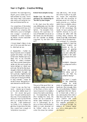 Year 12 English - Creative Writing Subsided. The cold nipped my Extract from analytical essay: ship with Harvy. This decep- fngers, and a colder wave of tion of the reader, in my opin- fear prickled my scalp. I knew Analyse how the writer has ion, makes the empathise that every step I took meant portrayed the relationships in more with the character of that safety was being left fur- ‘The Kiss’ by Kate Chopin. Brantain whom the writer ac- ther and further behind me. tually presents as a bufoon In this short story the writer rather than an eligible, attrac- The screeching of the brakes very deliberately uses the title tive bachelor. This presenta- was deafening and it was as if to mislead the reader’s expec- tion of him encourages the someone was screaming NO! tations. This deception fore- reader to have sympathy for With every ounce of strength shadows the duplicitous na- Nathlie’s decision to try and and courage I possessed I ture of Nathalie’s character as continue her afair with the continued to move towards the reader sees her intentions exciting Harvy whereas the my friend. I had to reach him are not romantic as initially reader now fully understands before the train. suggested by the title ‘The what it is like to be deceived. Kiss’. This portrayal of a character I forced Dylan’s lifeless body seeking to meet her out of the way and that was own comfort and it…time had run out. needs at the ex- pense of genuine In desperation I hurled my love and afection body forwards and I crumpled was also subtly illus- against the metal. I was fung trated in the open- to the side. Pebbles had once ing scene of the sto- been one of my favourite ry. things to collect however now they pushed themselves Nathalie’s character under my skin and scored my is juxtaposed with a nerve endings as I rolled over cat: and over, forced by the down- draught of the train. Blistering “She idly stroked pain shredded through my the satiny coat of torn up body. I slightly turned the cat that lay my head to see Dylan collapse curled in the lap” in the pain of losing his friend. In that moment I knew he The hard ‘c’ sounds would forever feel guilt but I of the alliteration was relieved to see him alive. create an aural The use of the word ‘Kiss’ im- sense of unpleasantness and I knew it was my fnal mo- mediately creates association harshness that strongly links ment. I looked up at beauty of the theme of love and ro- the cat and Nathalie. I think it as the stars smiled down at mance however it is actually a is signifcant that her charac- me – the clouds had gone story of deception and betray- ter is linked with a feline as now. The pain vanished and it al. Re-interpreting the title one unattractive feline trait is was over. I had completed the after reading the story, the that they seek their own ma- mission to save my best friend reader can see a parallel be- terial comfort and needs but in so doing had lost my tween Judas’ betrayal of Je- above the genuine afection. own life. I had condemned sus in Gethsemane for 30 This negative perception is my family to be ravaged by pieces of silver with Nathalie’s also developed through the grief but I hoped that one day desire to marry Brantain for sibilance in ‘stroked satiny’ they would heal enough to his ‘million’ when she de- and ‘sent a slow glance into feel pride at my actions. ceives him about her relation- the shadow’. THE BELLFORT SUMMER 2015 87