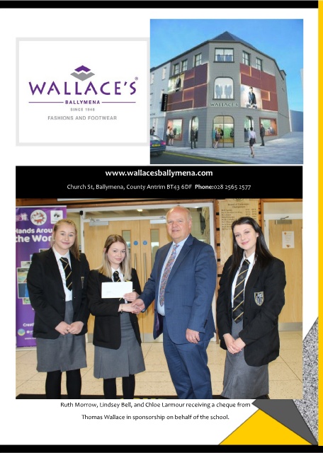 www.wallacesballymena.com Church St, Ballymena, County Antrim BT43 6DF Phone:028 2565 2577 Ruth Morrow, Lindsey Bell, and Chloe Larmour receiving a cheque from Thomas Wallace in sponsorship on behalf of the school. 41