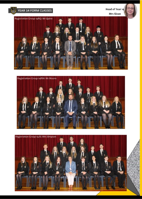 Head of Year 14 Mrs Sloan Registration Group 14RQ: Mr Quinn Registration Group 14RM: Mr Moore Registration Group 14JS: Mrs Simpson 55